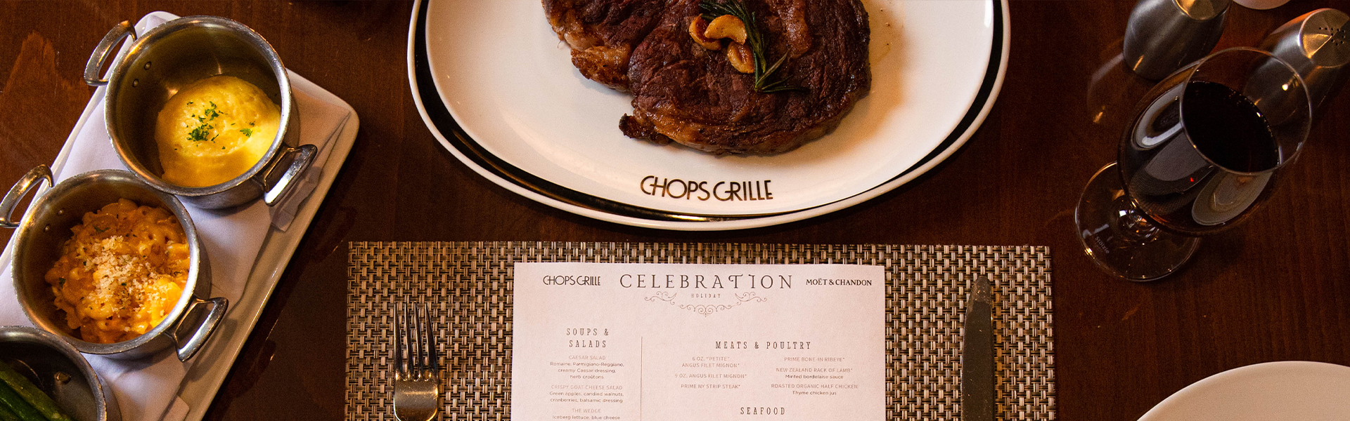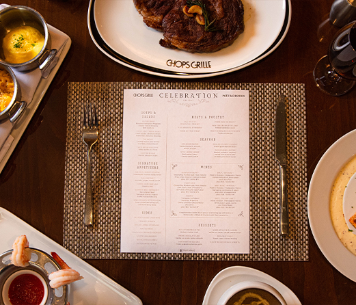 每位客人可以享用一杯免费的酩悦香槟,还有特别的节日龙虾尾。您也可以选择我们菜单上的经典主菜,如9盎司安格斯菲力牛排或炭烤海鲈鱼。晚宴的完美结尾,当然少不了诱人的甜点——香草冰淇淋搭配浆果酱的暖巧克力蛋糕。用这场经典飨宴,犒赏一年中最美好的时光。